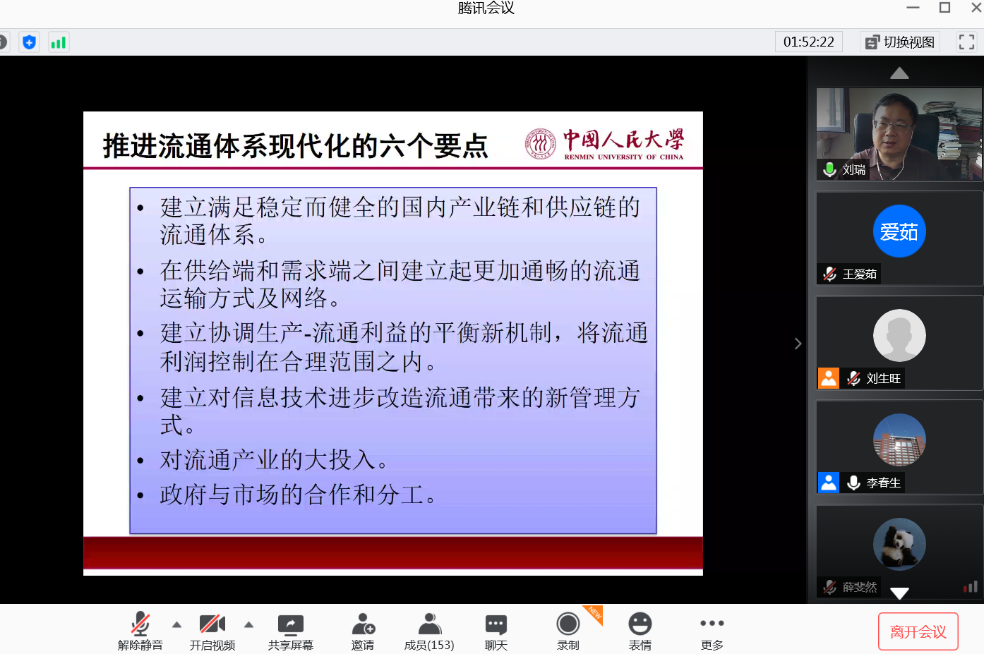 第一部分,如何理解习近平总书记提出的“国内大循环,国内国际双循环”。刘瑞教授首先讲述了这一提法的由来并从循环经济理论、认识误区、双循环形成背景等方面阐述了“双循环”的深刻内涵:认为以国内大循环为主体,绝不会是关起门来封闭运行,而是通过发挥内需潜力,使国内国际市场更好联通,更好利用国际国内两个市场、两种资源,实现更加强劲可持续的发展。第二部分,维持国际两个循环,打造国内五个良性循环。刘瑞教授首先指出了中国经济增长所面临的新挑战,随后刘瑞教授总结道我国在面临中美贸易战、新冠肺炎疫情和去中国化等诸多挑战时要积极维系国际大循环,坚持推进经济全球化;积极抵制美国单方“脱钩”行动,努力维护中美经贸合作格局。此外,中国还应该构建内部良性循环系统,即扩大内需、建立更加完整的产业链和供应链、建立更加协调的区域经济体系、构建实体经济与虚拟经济良性循环体系、构建经济与社会的良性循环体系。第三部分,畅通流通将是供给侧结构性改革下一个阶段任务。刘教授认为在疫情暴发后,产能过剩不再是主要矛盾,而物流不畅则是突出问题。因此在部署双循环新发展格局中,应当把建设现代流通体系作为一个打通国民经济循环的主攻方向。此外,刘教授指出流通与生产在供给侧改革中具有循环统一的关系,因此在开展流通供给侧结构性改革时仍然要继续推进生产供给侧结构性改革。最后,刘教授还详细阐述了推进流通体系现代化的六个要点。
