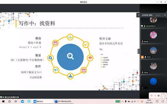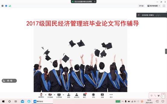 为了帮助即将毕业的2017级同学顺利完成毕业论文的写作,2021年4月5日晚,国民经济管理系主任李春生老师开办了一场讲座,张晋晋老师、2016级国民经济管理专业优秀毕业生黄钰同学以及2017级国民经济管理班全体成员参加了本次活动。