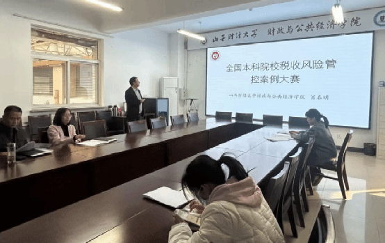 肖春明老师于学院会议室,结合多年来指导学生参加“全国本科院校税收风险管理案例大赛”的实践经验,就赛事组织、案例设计与团队协作等方面向全体教师进行了分享。